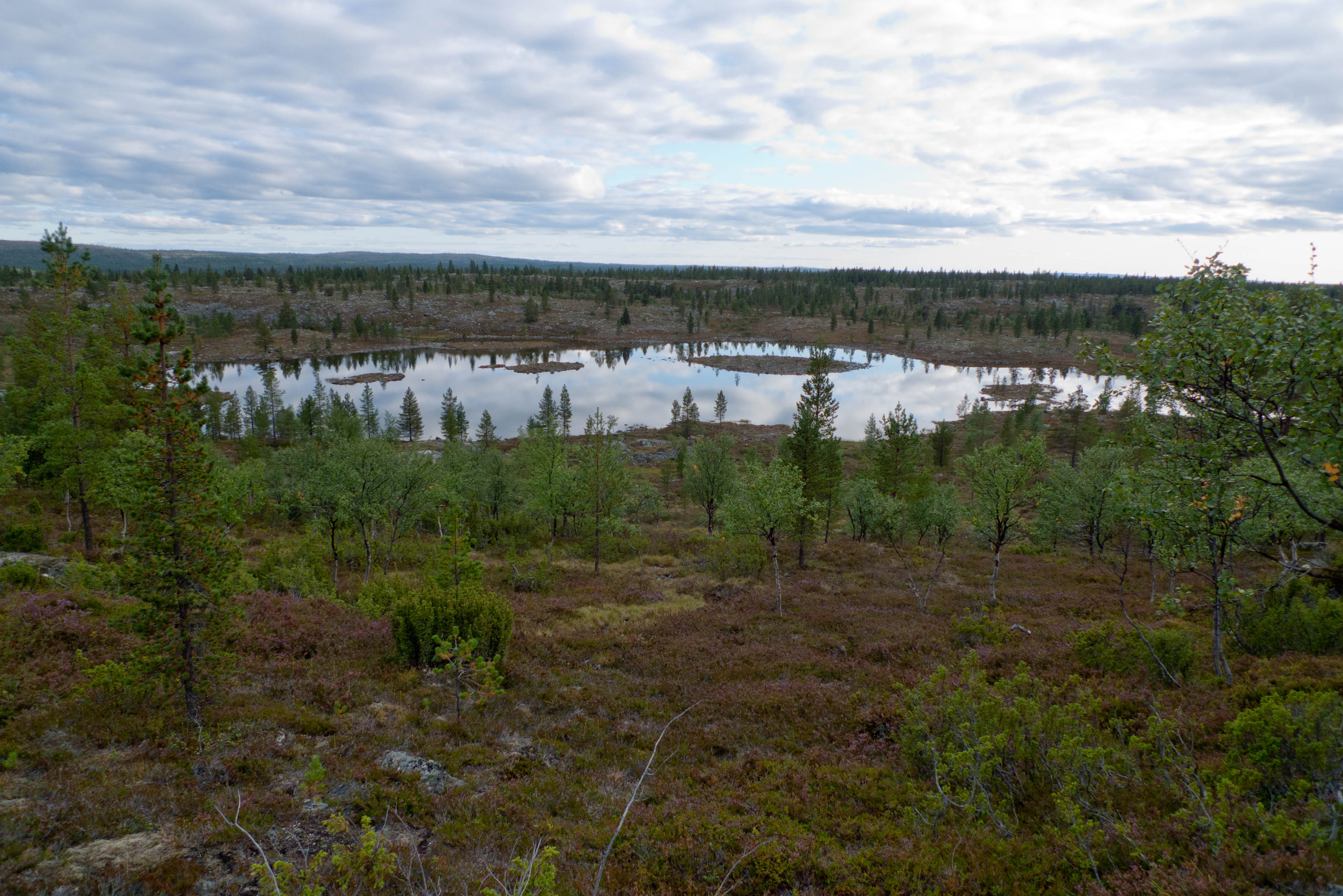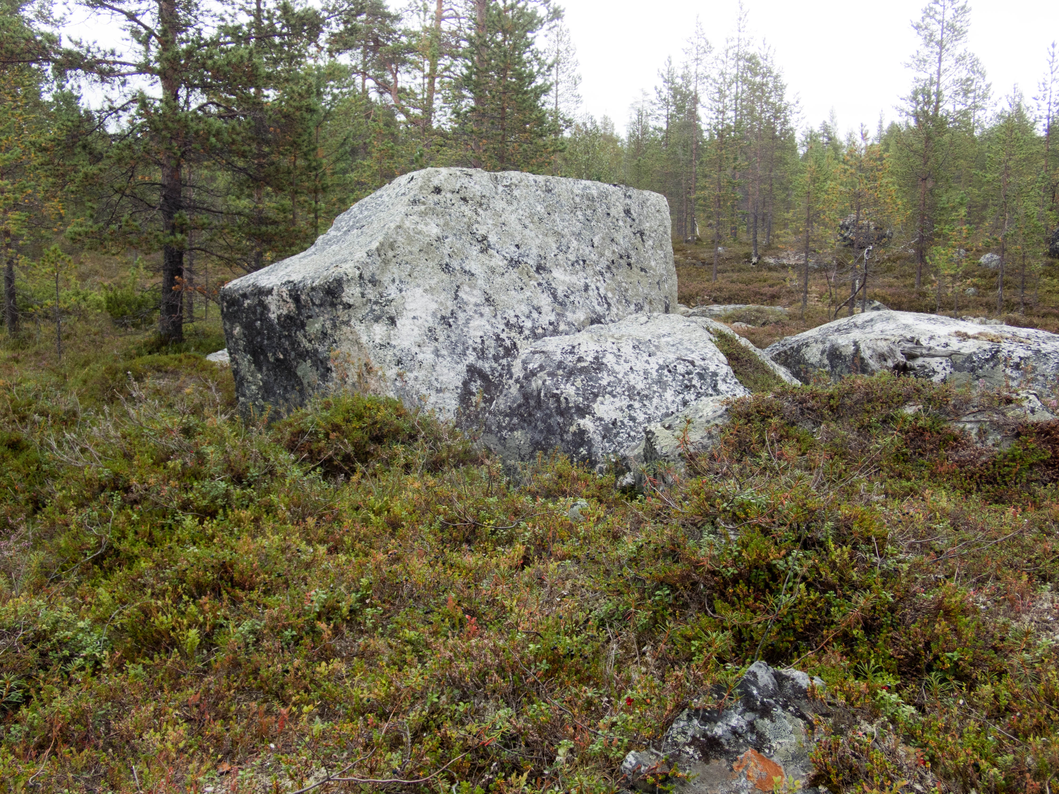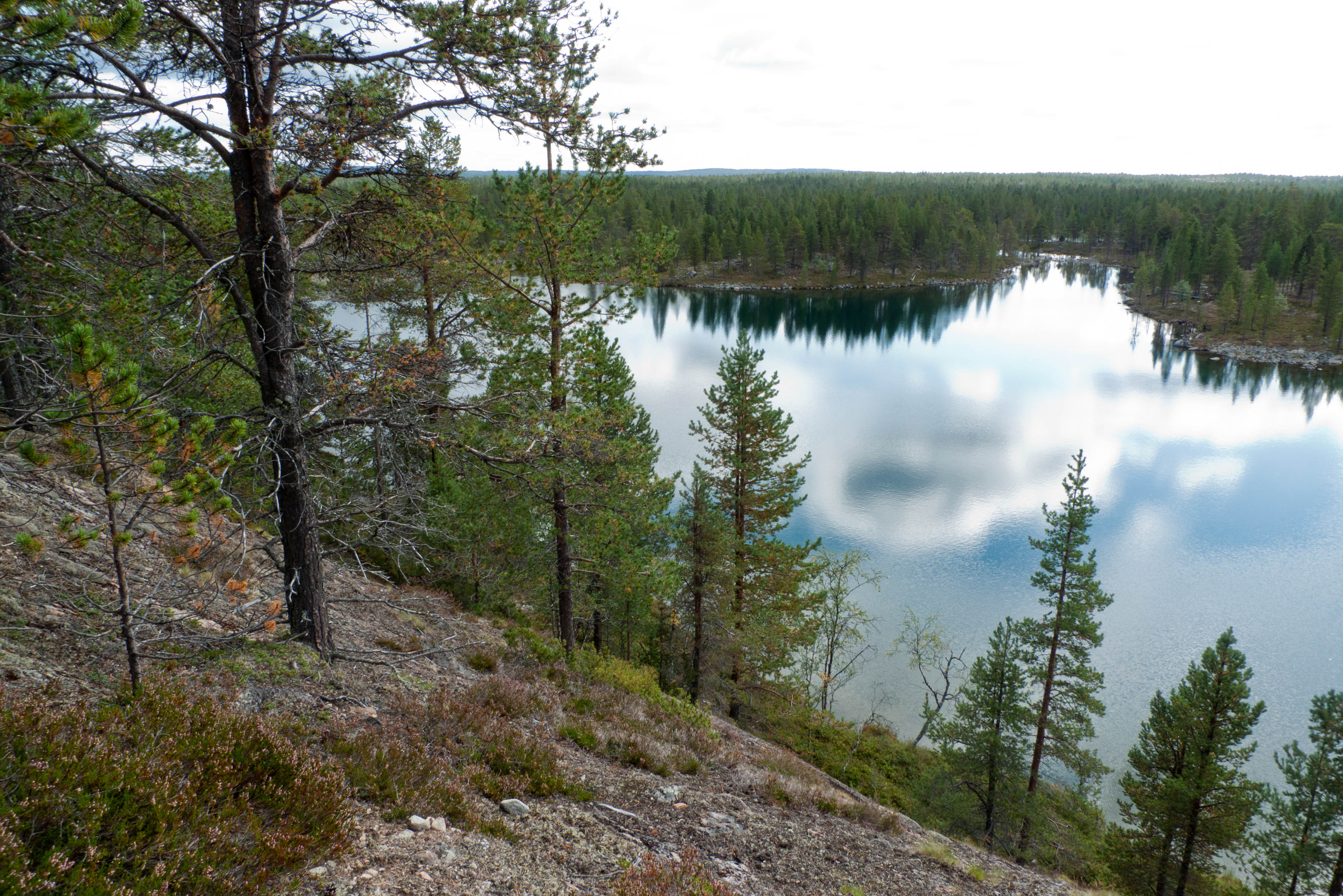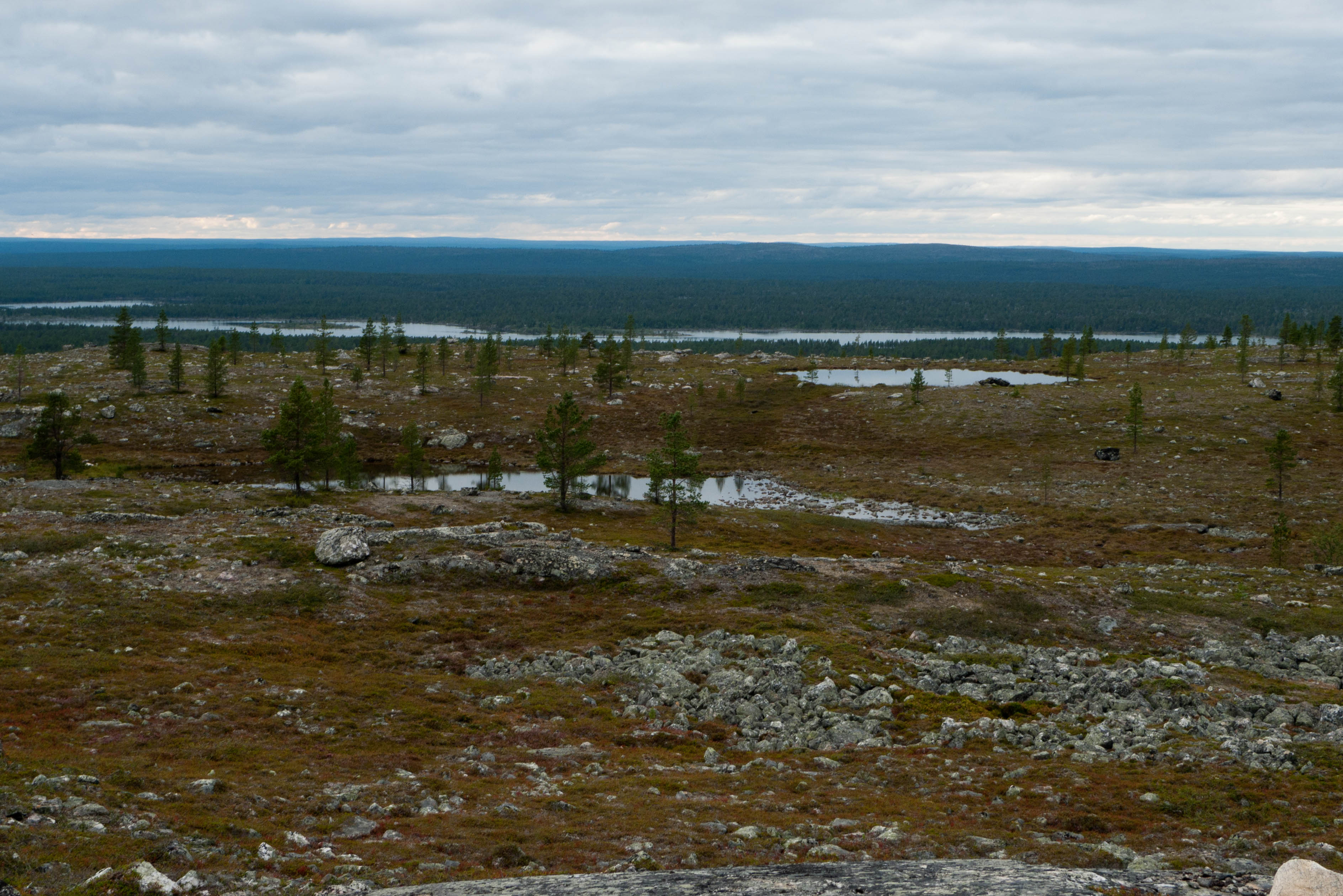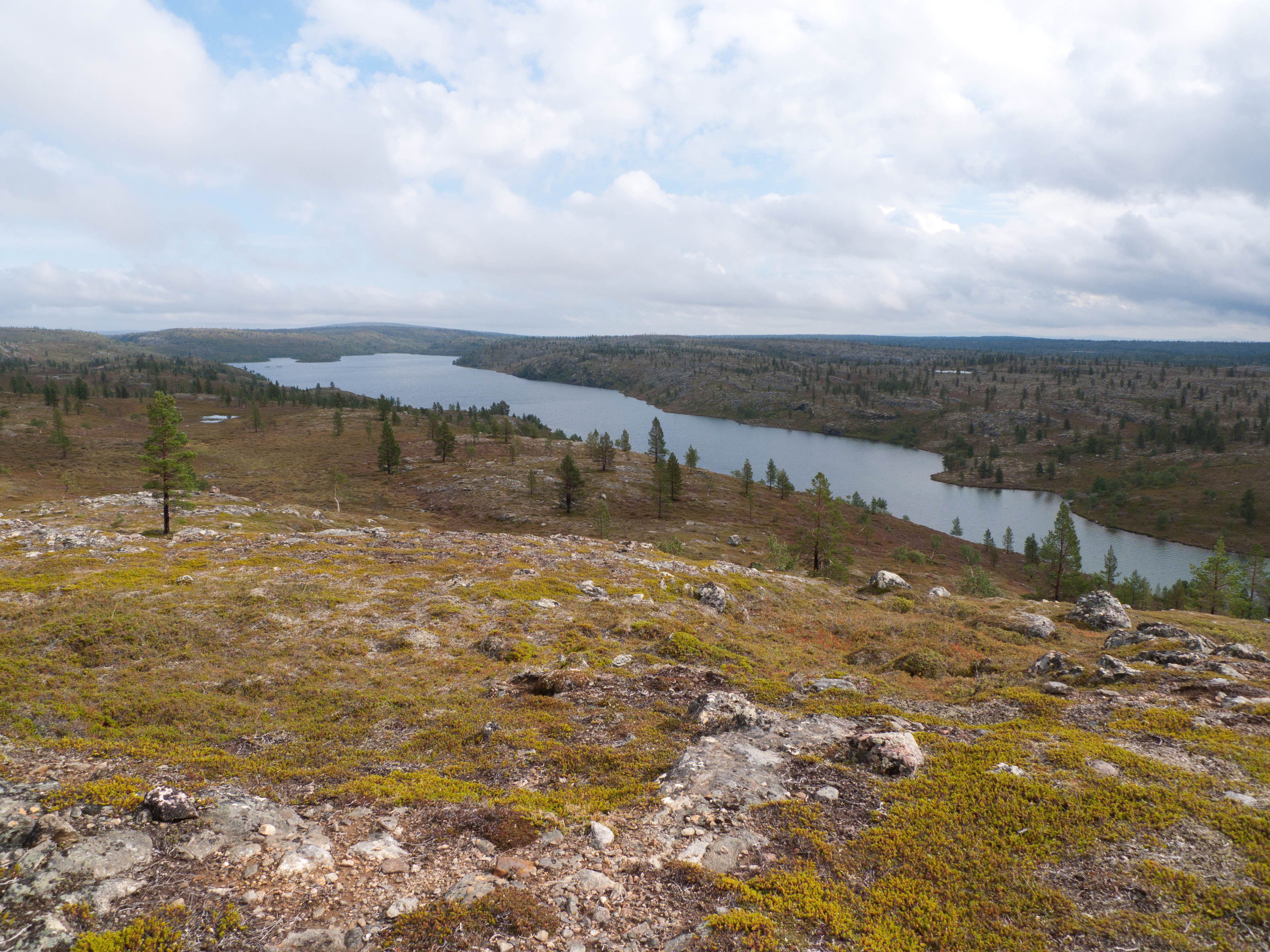 Aamu oli edellisen kaltainen. Sumu oli niin sakeaa, että näkyvyyttä oli vain pari sataa metriä. Liikkeelle lähdettiin sadehousuissa ja pitkähihaisessa paidassa. Tavoitteena oli Taljavaaran pohjoispuolella oleva nimetön järvi, jota olimme sivunneet edellisellä reissulla 2011. Ensimmäinen välietappi oli Hirvasjärven itäpääty, johon olimme leiriytyneet em. reissulla. Maasto oli kivikkoista ylänköä, jossa kasvoi harvakseltaan puita, ei kovin helppokulkuista. Suuntaa piti vähän väliä katsoa kompassista, kun ei näkynyt mitään erityisiä maanmerkkejä. Lopulta Hirvasjärvi putkahti esiin sumun seasta. Siellä näytti olevan kaksi lasikuituvenettä kenollaan samassa paikassa kuin edelliselläkin reissulla. Meidän kymmenen vuotta sitten kunnostama nuotiopaikkakin oli entisellään. Ehkä sitä oli joku käyttänyt, kun sammaltakaan ei ollut pohjalla. Matka jatkui turhalla kiipeämisellä edessä olevalle mäelle vain toteamaan, että sen takana on suota joka puolella. Seuraava moka tehtiin Hirvasselän pohjoispuolella, kun tultiin nimettömän, korkeudella 153.0 olevan järven rantaan. Jotenkin pääteltiin, että edessä oleva kapeikko on se järven päässä oleva kannas ja vesi on niin korkealla ettei siitä eikä seuraavastakaan pääse yli. Joten lähdettiin kiertämään oikean kautta yksi ylimääräinen kilometri. Näitä mokia on vaikea käsittää kotona nettikartan ääressä, mutta rinkka selässä vähän väsyneenä ja itikoiden inistessä päättelykyky joskus sakkaa. Siinä kannaksella olevassa lätäkössä lillui erikoisen näköistä mössöä, vaikka järven vesi oli molemmin puolin ihan kirkasta. Loppumatka sujui taas ongelmitta. Nimettömän kohdejärven eteläkärjessä odotti sama veistoksellinen juurakko, jonka ikuistin edellisellä reissulla. Vähän näyttää ajan hammas syöneen. Puolukka oli ottanut rungon kasvualustakseen ennen sen maatumista. Lähdettiin etsimään telttapaikkaa järven länsirannalta. Aika pitkälle saatiin mennä, mutta lopulta löydettiin oikein hyvä leiripaikka. Matkalla törmättiin erikoiseen luonnon muovaamaan vesiliukumäkeen, ei kuitenkaan testattu. Illan mittaan kierrettiin koko järvi kalastellen, mutta ei mitään. Syvyyttäkin oli paikoitelleen niin, että luulisin kalan selviävän talven yli. Tummuvassa illassa tuijoteltiin tyyntyvää järven pintaa, mutta yhtään selvää tuikkia ei näkynyt. Pitäisiköhän tämäkin järvi liittää Vätsärin lukuisaan Kalattomien järvien luetteloon.