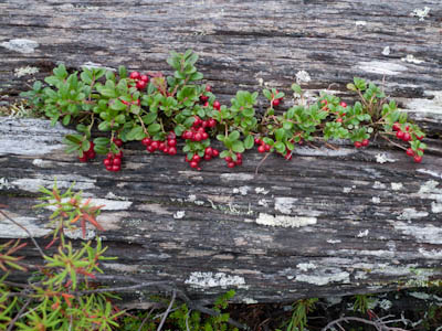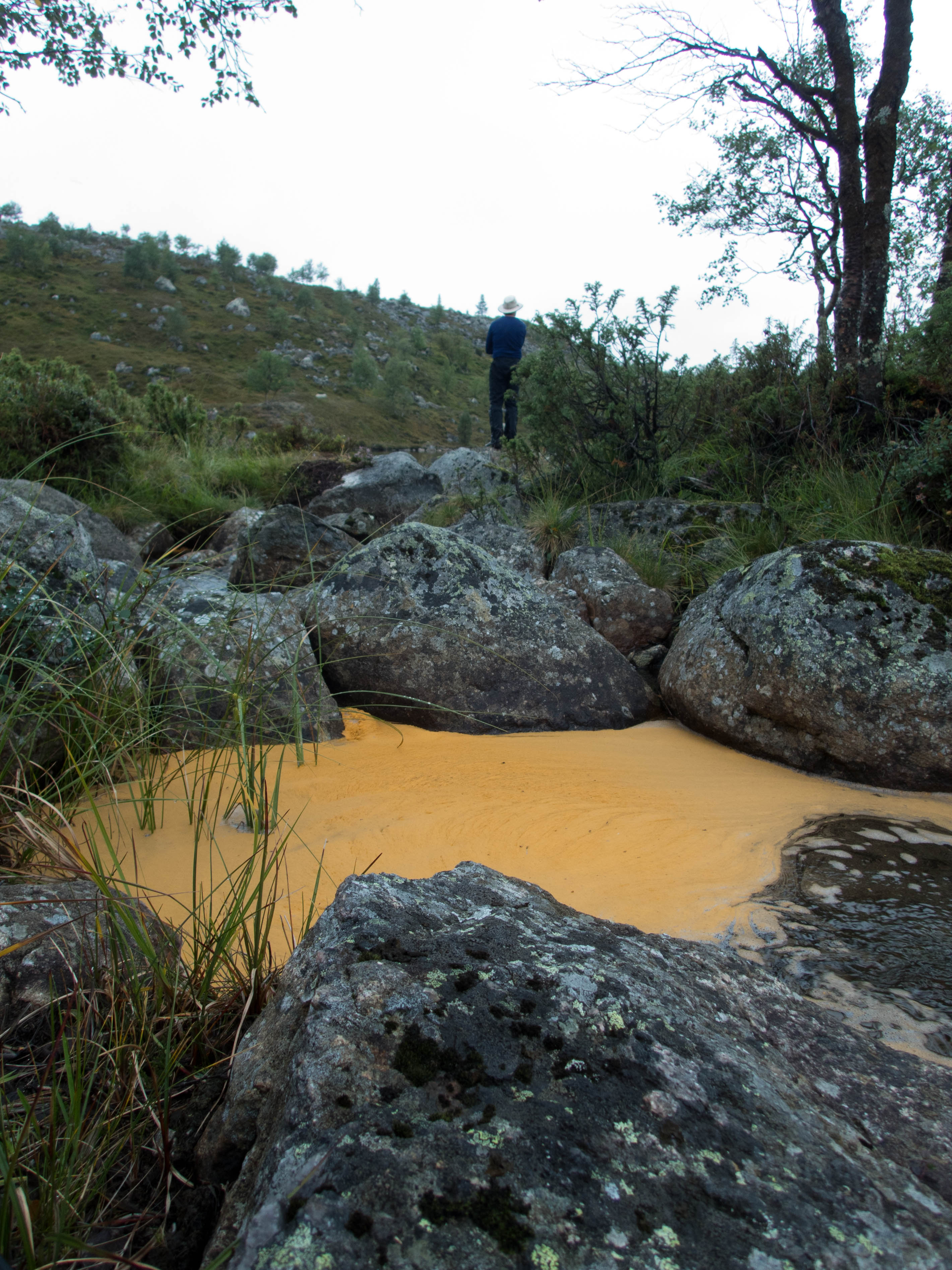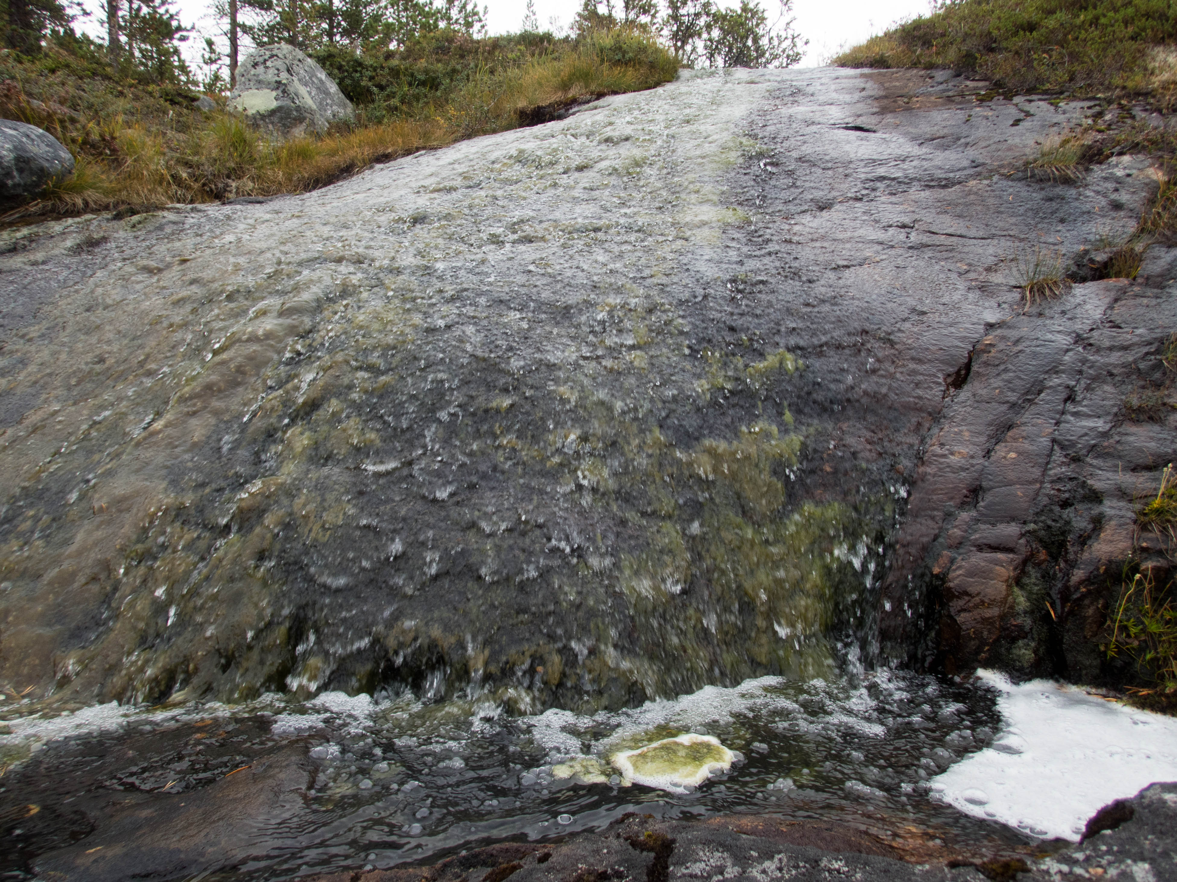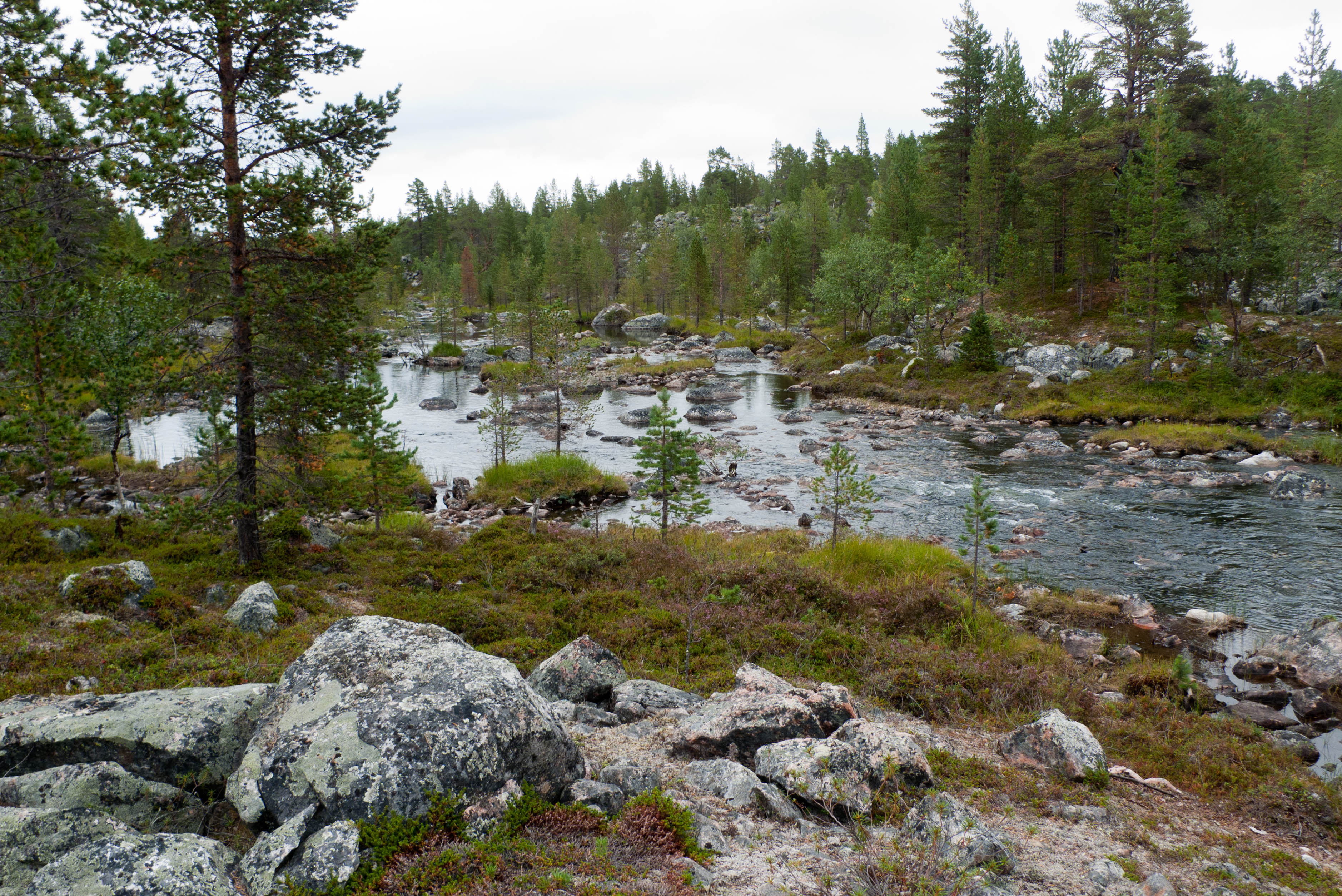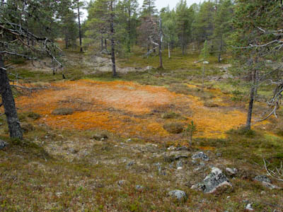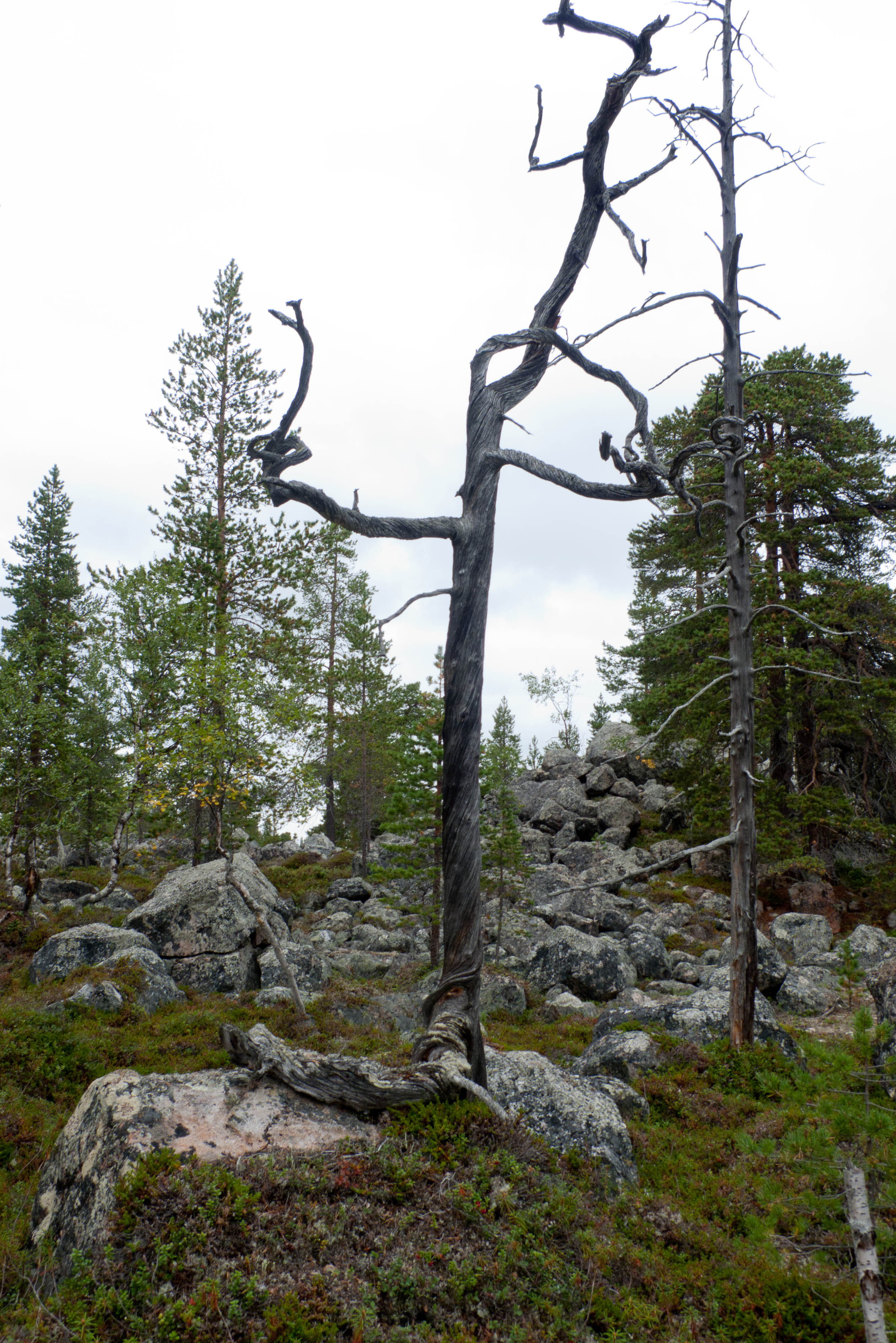 Aamu oli edellisen kaltainen. Sumu oli niin sakeaa, että näkyvyyttä oli vain pari sataa metriä. Liikkeelle lähdettiin sadehousuissa ja pitkähihaisessa paidassa. Tavoitteena oli Taljavaaran pohjoispuolella oleva nimetön järvi, jota olimme sivunneet edellisellä reissulla 2011. Ensimmäinen välietappi oli Hirvasjärven itäpääty, johon olimme leiriytyneet em. reissulla. Maasto oli kivikkoista ylänköä, jossa kasvoi harvakseltaan puita, ei kovin helppokulkuista. Suuntaa piti vähän väliä katsoa kompassista, kun ei näkynyt mitään erityisiä maanmerkkejä. Lopulta Hirvasjärvi putkahti esiin sumun seasta. Siellä näytti olevan kaksi lasikuituvenettä kenollaan samassa paikassa kuin edelliselläkin reissulla. Meidän kymmenen vuotta sitten kunnostama nuotiopaikkakin oli entisellään. Ehkä sitä oli joku käyttänyt, kun sammaltakaan ei ollut pohjalla. Matka jatkui turhalla kiipeämisellä edessä olevalle mäelle vain toteamaan, että sen takana on suota joka puolella. Seuraava moka tehtiin Hirvasselän pohjoispuolella, kun tultiin nimettömän, korkeudella 153.0 olevan järven rantaan. Jotenkin pääteltiin, että edessä oleva kapeikko on se järven päässä oleva kannas ja vesi on niin korkealla ettei siitä eikä seuraavastakaan pääse yli. Joten lähdettiin kiertämään oikean kautta yksi ylimääräinen kilometri. Näitä mokia on vaikea käsittää kotona nettikartan ääressä, mutta rinkka selässä vähän väsyneenä ja itikoiden inistessä päättelykyky joskus sakkaa. Siinä kannaksella olevassa lätäkössä lillui erikoisen näköistä mössöä, vaikka järven vesi oli molemmin puolin ihan kirkasta. Loppumatka sujui taas ongelmitta. Nimettömän kohdejärven eteläkärjessä odotti sama veistoksellinen juurakko, jonka ikuistin edellisellä reissulla. Vähän näyttää ajan hammas syöneen. Puolukka oli ottanut rungon kasvualustakseen ennen sen maatumista. Lähdettiin etsimään telttapaikkaa järven länsirannalta. Aika pitkälle saatiin mennä, mutta lopulta löydettiin oikein hyvä leiripaikka. Matkalla törmättiin erikoiseen luonnon muovaamaan vesiliukumäkeen, ei kuitenkaan testattu. Illan mittaan kierrettiin koko järvi kalastellen, mutta ei mitään. Syvyyttäkin oli paikoitelleen niin, että luulisin kalan selviävän talven yli. Tummuvassa illassa tuijoteltiin tyyntyvää järven pintaa, mutta yhtään selvää tuikkia ei näkynyt. Pitäisiköhän tämäkin järvi liittää Vätsärin lukuisaan Kalattomien järvien luetteloon.