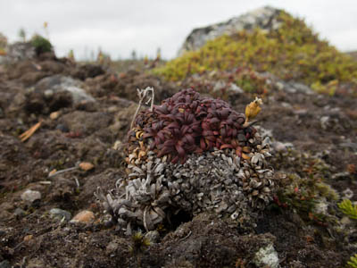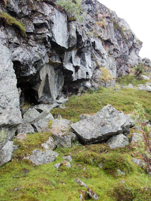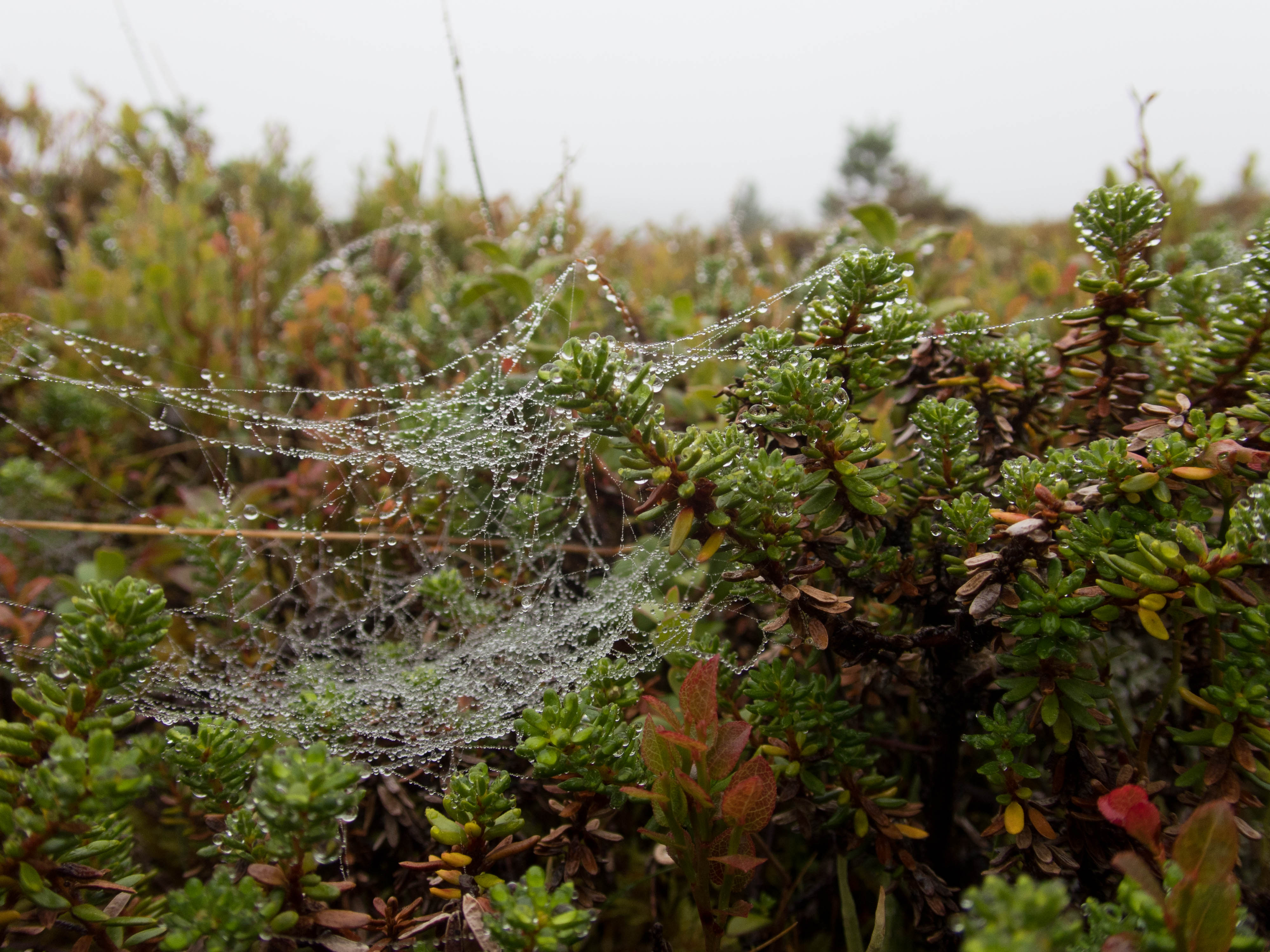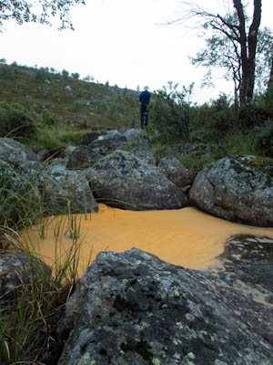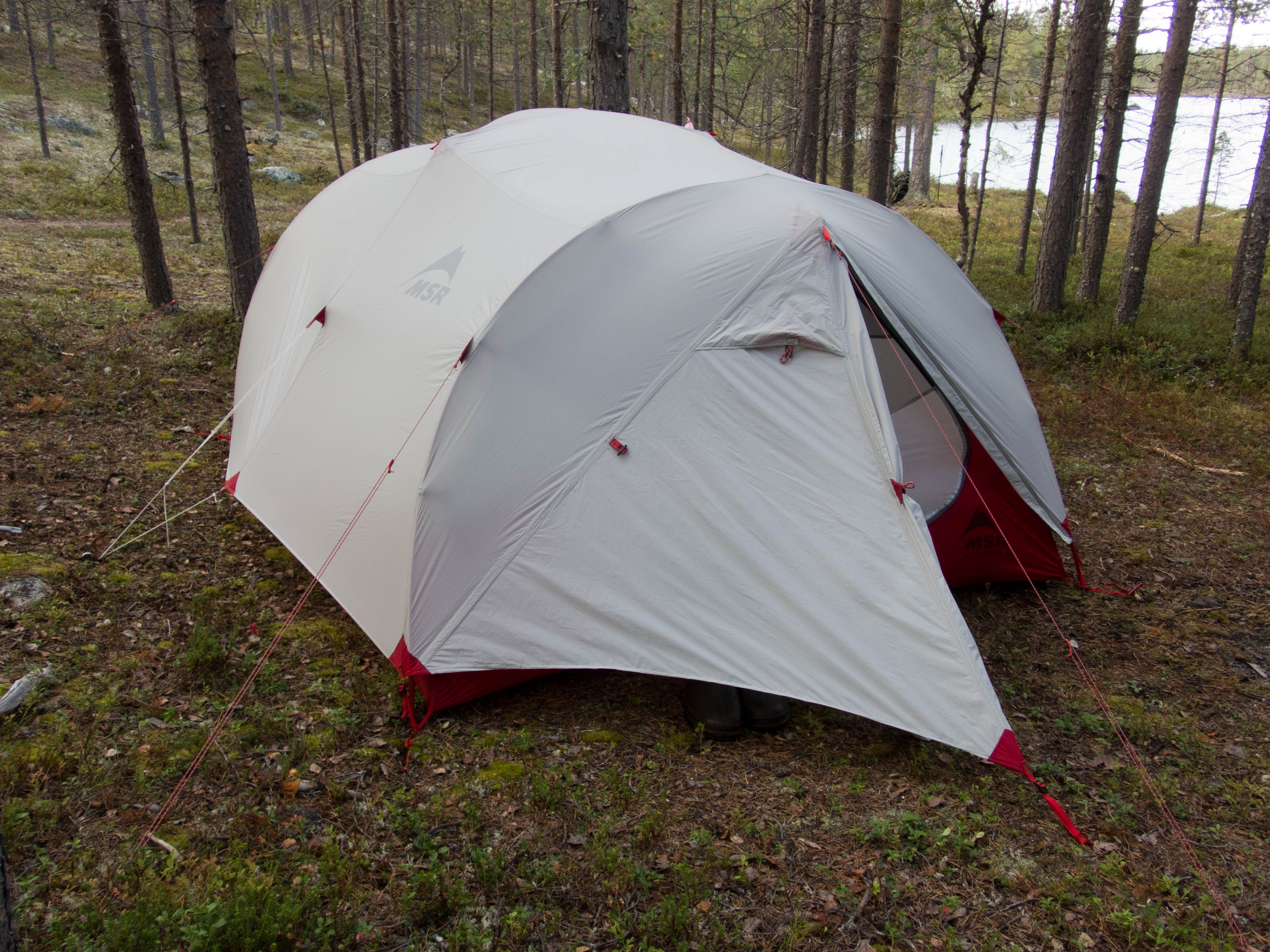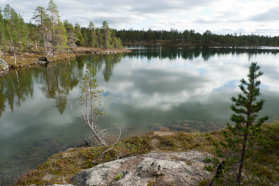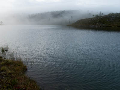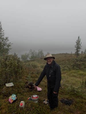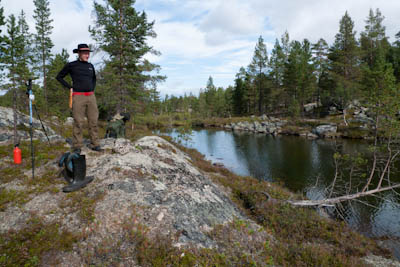 Aamulla ei enää satanut, mutta kylmä sumutunki luihin ja ytimiin. Ei yhtään auttanut, että päälivaatteet olivat edelleen kuin märkiä rättejä. Maasto oli niin märkää, että vaelluskengät eivät kauaa pysyisi kuivina, onneksi oli saappaat. Sateen todennäköisyys näytti vähäiseltä, mutta rinkat sentään suojattiin kaiken varalta. Päivän asuste oli pitkähihainen paita ja sadehousut. Tavoitteena Taimenlammet lähdettiin rantaa seuraillen koilliseen. Siinä, missä Surnujärven pitkä lahdelma päättyy on aika korkea nyppylä, josta näkee myös Lujapuolijärvelle. Kun päästiin laelle, näytti siltä, että aurinkokin saattaisi näyttäytyä. Pidettiin tauko ja kaivettiin kamerat esille. Löytyi mm. koristeellisella katolla varustettu myyrän kolo. Kun sadevaatteet oli pakattu rinkkaan, lasketeltiin ensin vähän alamäkeä ja lopuksi noustiin melko jyrkkä ylämäki. Isoimman Taimenlammen kaakkoisnurkan matalan lahdelman tyynestä pinnasta heijastuva aurinko lämmitti niin mukavasti, että huomasimme tilaisuuden tulleen retken ensimmäiseen ja lopulta ainoaan puhdistautumisrituaaliin. Eipä siinä ehditty kauaa kuivatella, kun sateen uhka jo hätisti vaatteita päälle. Siitä uimapaikan läheltä löysimme jonkun vakikävijän jättämän ryönäläjän. Jatkoimme matkaa tämän isoimman lammen pohjoispuolella olevalle lammelle, jossa aiemman reissun jättämän muistikuvan perusteella saattaisi olla mahdollisuus siedettävään teltan paikkaan. No, tasan yksi löytyi. Oli myös jonkinlainen nuotiopaikka, vaikka juurikaan mitään poltettavaa ei ollut. Iltanuotiosta ei kannattanut muutenkaan haaveilla, sillä välillä satoi melko rankasti. Se ilta oli kyllä säiden puolesta monipuolinen. Välillä oli ihan nättiä, välillä taas oltiin ihan pilvessä. Tyyninä hetkinä näkyi runsaasti tuikkeja, mutta perhot tai lipat eivät kelvanneet. Lopulta saatiin "lerssillä" narratuksi pari tammukkaa, joista tehtiin iltapalaa trangian pannulla.