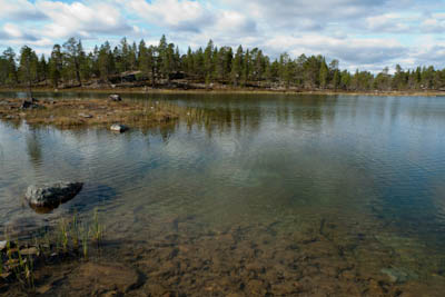 Neljän maissa oltiin valmiina jättämään jäähyväiset sivistykselle. Heti alkuun tuli vastaan sellainen aitahärdelli, että piti tarkkaan katsoa mistä portista lähti menemään. Osuttiin oikealle polulle, joka kulki aitauksessa lähes kaksi kilometriä loivaa ylämäkeä Pänttärinlammen kohdalla olevalle portille. Siitä aukesikin jo näkymä Sollomusjärvelle ja oli sopiva hetki suoristella vähän sukkien ryppyjä. Siitä eteempäin mentiin mönkkärin mentävää kivistä polkua pitkin enimmäkseen alamäkeen toiset kaksi kilometriä ensimmäiselle kelvolliselle juomapaikalle. Se on aina juhlava hetki nostaa ensimmäinen "malja" erämaalle. Siitä olikin enää vajaat pari kilometriä Sollomusjärven autiotuvalle. Ennen tupaa ylitetyn venetien jälkeen kivikko muuttui hiekkaharjuksi. Tuvan pihalla oli hulppea grillipaikka varustettuna masiivisella pöydällä ja ympärillä oli runsaasti hyviä telttapaikkoja. Tuvalla oli kolmen nuoren seurue, joka oli asettunut taloksi vähän sen oloisina, että olisi ollut sääli jäädä sinne yöpymään. Eipä meillä ollut tarkoituskaan jäädä ihan niin lähelle lähtöpaikkaa. Otimme tavoitteeksi Venttijärven ja vähän pienemmän nimettömän järven välissä olevan kannaksen, joka vaikutti kartalla olevan kelvollista leirintämaastoa. Suunnisteltiin puolihuolimattomasti itäkaakkoon ja osuttiin lähelle Venttijärven länsipäätä. Vähän siinä ihmeteltiin, että kumman järven pää siinä näkyi, kun rantapenkka vaikutti niin jyrkältä. Käynti kannaksella sai ilmeet muikeiksi. Pienemmän järven rannassa oli valmis nuotiopaikka ja hyvää telttailumaastoa. Iltaa istuskeltiin seesteisessä kelissä ihastellen kristallinkirkkaan järven tyyntä pintaa. Kalaakin koitettiin tunnin verran, mutta pinnan alla ei vaikuttanut olevan mitään eloa sen paremmin kuin pinnallakaan.