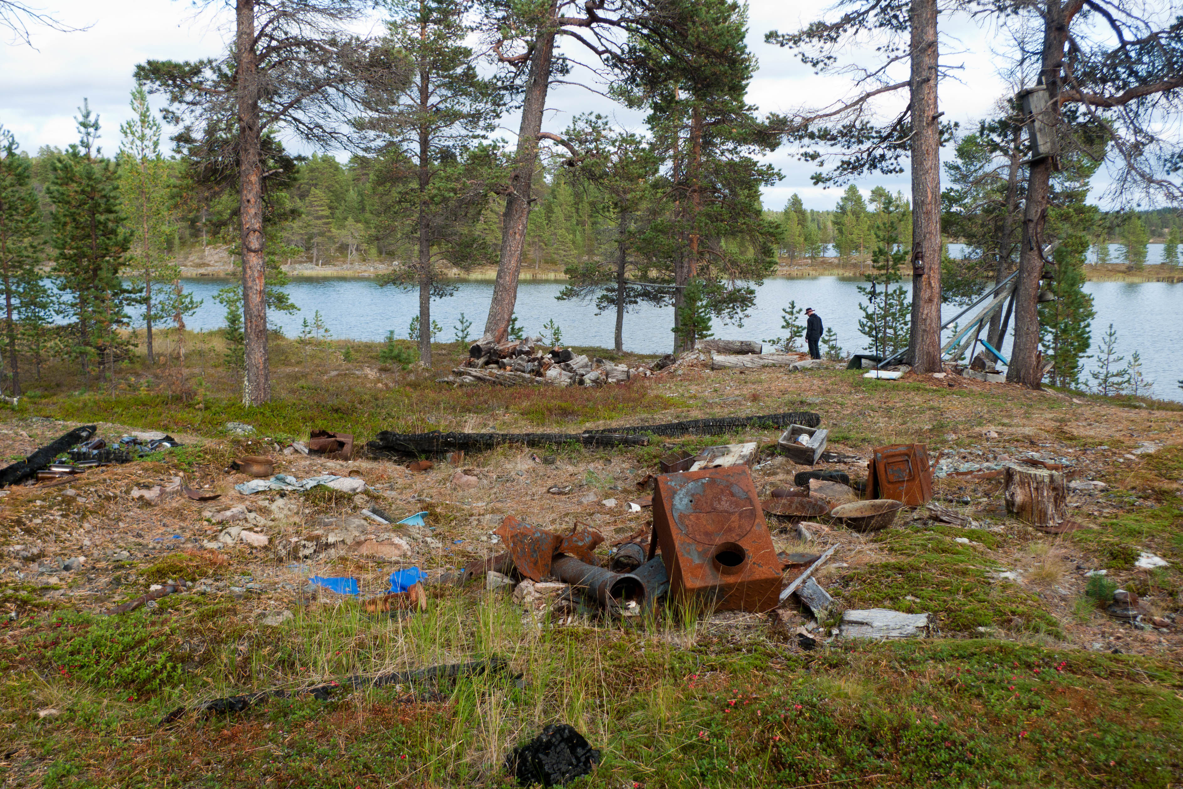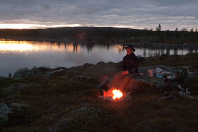 Tarkoituksena löytää viimeiseksi illaksi hieno ja kalaisa leiripaikka kohtuullisen matkan päässä autosta, ei kuitenkaan mistään polun varrelta. Lähdettiin kulkemaan lounaaseen. Lähestyessämme Pahtareikäjärveä alkoivat maaston muodot pehmentyä. Sattumalta osuttiin hienoon paikkaan, joka on varmaan toiminut monien porukoiden leiripaikkana. Ihme kyllä paikka oli pysynyt siistinä, ei muoviroskia eikä edes ruostuneita säilyketölkkejä nuotion pohjalla. Oli juuri oikea hetki ja oikea paikka ryhtyä syömäpuuhiin. Tunnelma kohosi kattoon, kun aurinkokin vielä näyttäytyi. Matka jatkui järven pohjoisrantaa länteen. Nyt olitiin jo tultu vähän liian lähelle "sivistystä", koska rannalla lojui eri näköistä ihmisen tarviketta, olipa yksi perämoottorivenekin ja jonkinlainen bensavarasto. Järven päästä suunnattiin Pätsikotajärven etelärannalle. Vastarannalla alkoi näkymääm hiekkaisia maisemia, mikä antoi toivoa hyvästä teltan paikasta muuten niin kivikkoisessa maisemassa. Päästyämme vähän yli puoleenväliin, ällän muotoisen järven kohdalle, aukeni eteemme varsinainen biitsi, jonka läpi laski älläjärvestä pieni puro Pätsikotajärveen. Pienuudesta huolimatta se oli muodostanut aikojen saatossa melko pitkälle ulottuvan matalan hiekkarannan, jossa ei ollut mitään töhnää niin kuin erämaajärvissä yleensä on hiekan päällä. Jätimme rinkat siihen ja lähdimme tutkimaan järven rantaa eteenpäin. Siinä olikin melkoista hiekkaharjua pitkän matkaa, mutta ihan rannan tuntumasta ei löytynyt kuin yksi hyvä leiripaikka ja siihen oli tietysti joku pystyttänyt telttansa, pyykkejä kuivui narulla. Kävi siinä asukaskin näyttäytymässä, mutta sananvaihto jäi väkinäiseen tervehdykseen. Ei näyttänyt olevan keskustelutuulella, pelkäsi kai meidän tunkevan liian lähelle leiriään. Kävimme katsastamassa järven länsipäädyssä olevan tuhoutuneen kammin ja se näytti juuri siltä kuin olimme kuvitelleetkin. Ruosteiset hellan jäännökset, hiiltyneitä hirsiä, muoviroskaa ja tietysti pulloja lojui aika laajalle levittäytyneenä. Palasimme takaisin rinkoille ja löysimme ihanteellisen leiripaikan älläjärven rannalta.