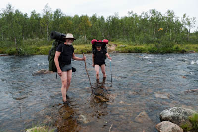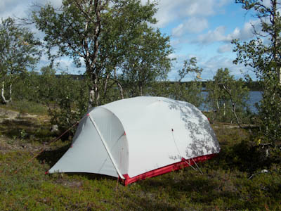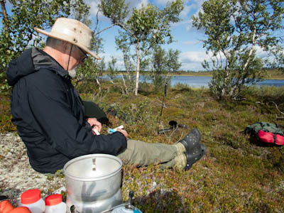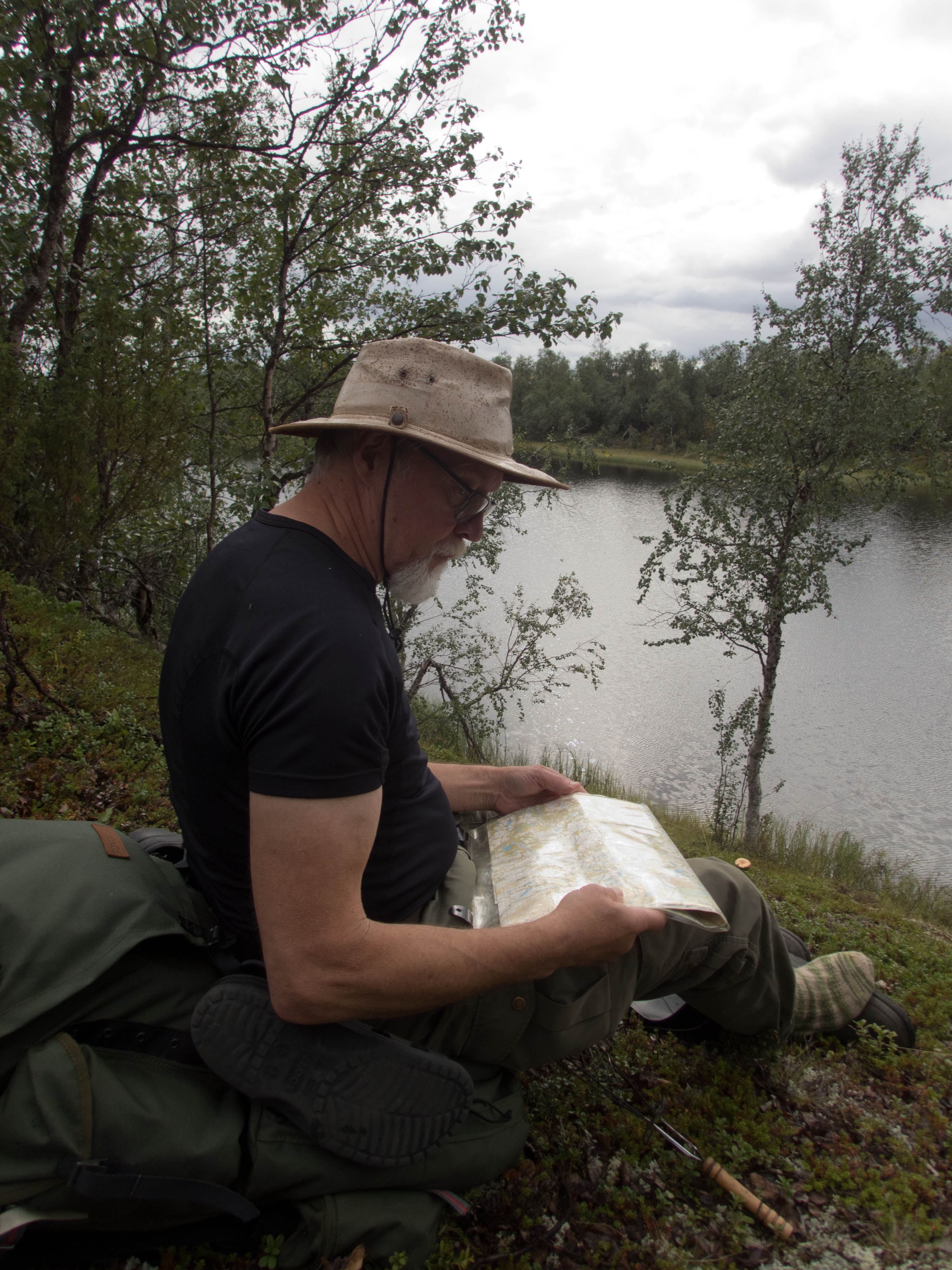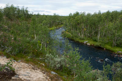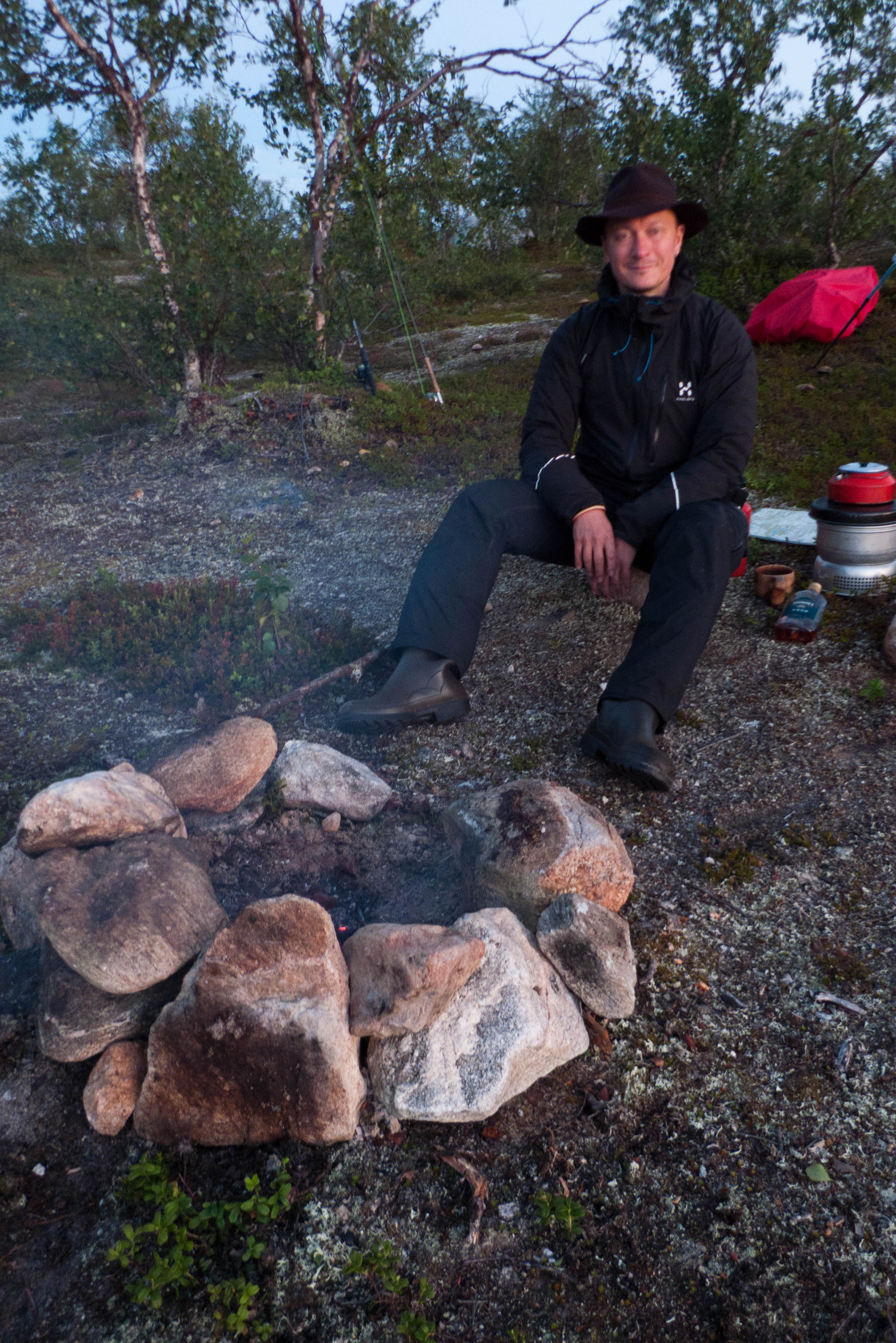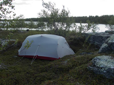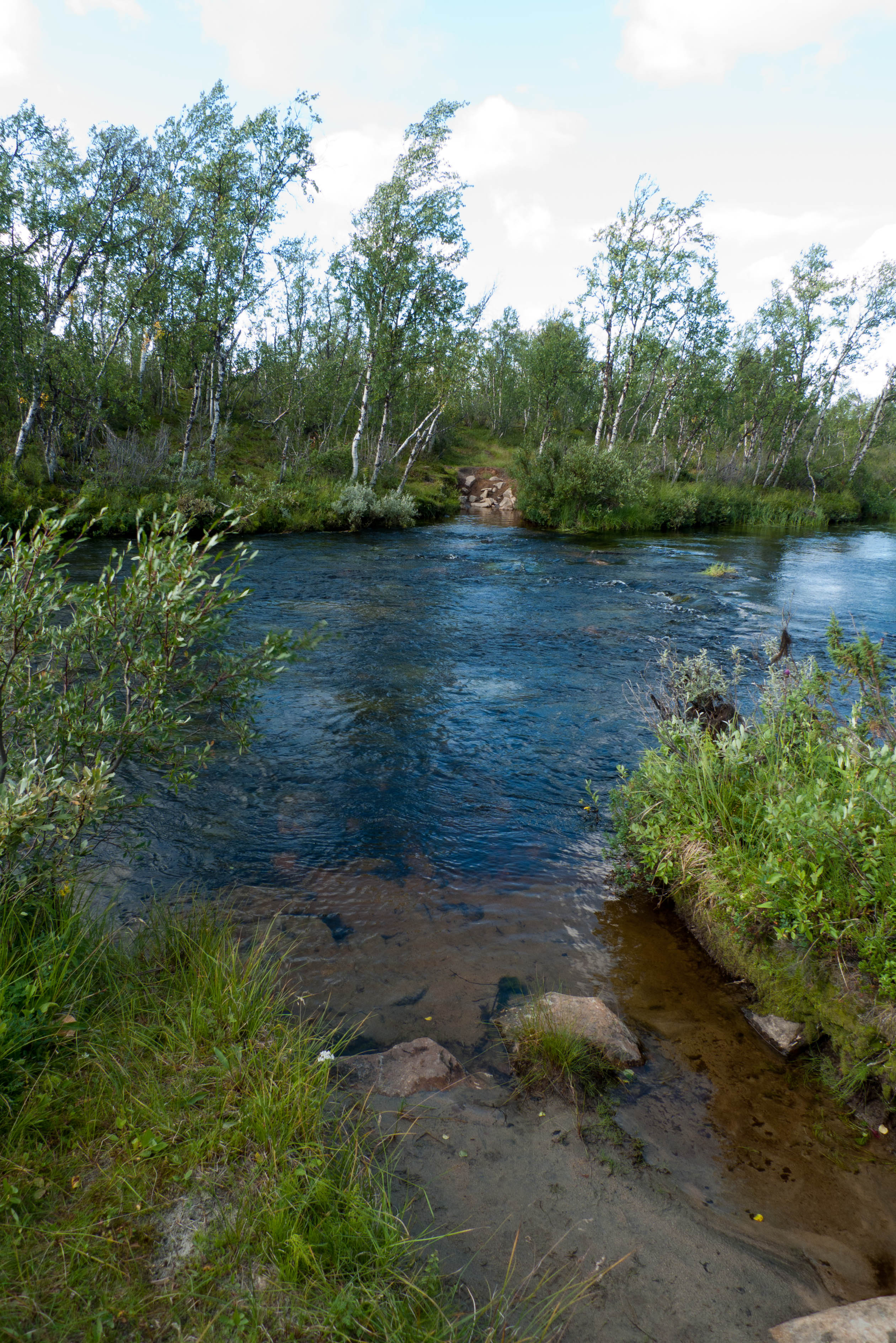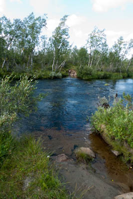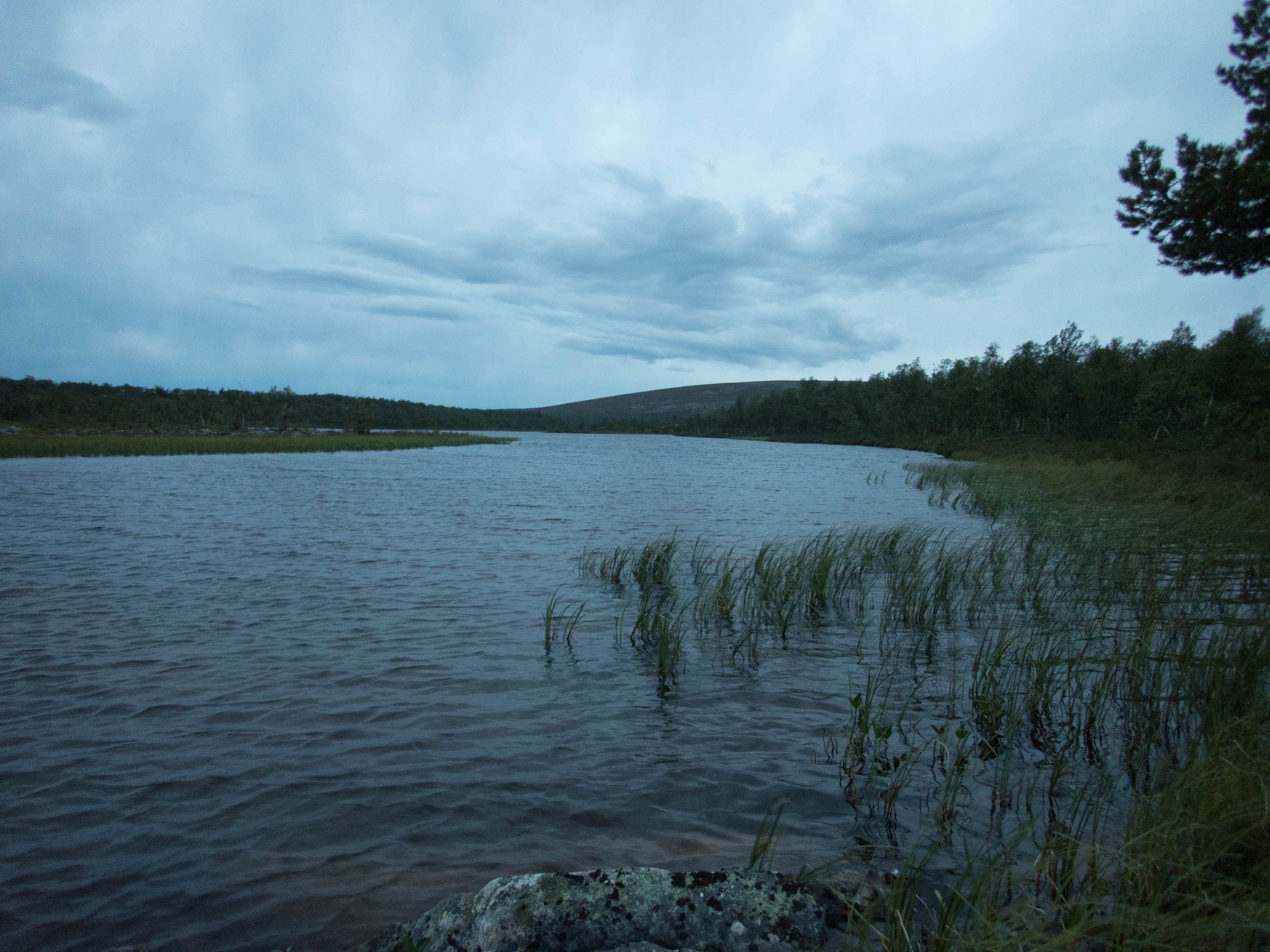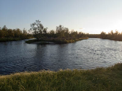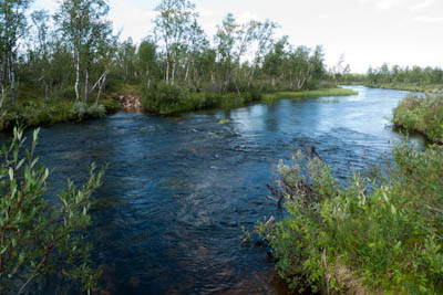 Päästiin liikkeelle jo ennen puolta päivää, kun ei tarvinnut purkaa leiriä. Mitään kovin tarkkaa reittisuunnitelmaa ei ollut, mutta päätettiin käydä tutustumassa seuraavaan vähän suurempaan lompoloon, joka on nimeltään Jokilommol. Sitä ennen piti päästä Käkkälöjoen länsipuolelle. Pysyteltiin turvallisesti mönkkäriuralla. Heti kilometrin päässä olin pieni liru, jossa oli ollut oikein silta, joka nyt makasi toisella rannalla. Kun oli hyvä ilma, ei lähdetty etsimään parempaa ylityspaikkaa, vaan riisuttiin saappaat suosiolla. Fielmasjärven kohdalla poikettiin mönkkäriuralta rantaan ihastelemaan hienoa hiekkarantaa. Oivallinen leiripaikka, mutta nyt ei ollut aikaa jäädä siihen. Kilsan verran eteenpäin tuli Käkkälöjoen ylittävä kahlaamo. Oltiin tehty kolmen kilsan lenkki, jossa jouduttiin kaksi kertaa kahlaamaan, ja päästy kilsan päähän lähtöpisteestä. Joki oli kahlaamon yläpuolella kalastuksellisesti houkutteleva, mutta ei sitä nyt keskellä päivää. Matkaa jatkettiin rantaa seuraillen, vaikka siinä oli kartan mukaan suota. Luotettiin siihen, että joessa on useimmiten jonkinlainen rantapenkka. Siinä jokivartta pitkin kulkiessa tuli vastaan toinen toistaan hienompia koskia ja suvantoja. Jokilommolin rannalta ei löytynyt hyvää teltan paikkaa. Loppujen lopuksi leiri tehtiin Rupijärven rannalle. Sieltä sitten käytiin kalastamassa Jokilommol. Saaliiksi saatiin kelpo ahven ja ärhäkkä hauki, joka vapautettiin. Ahvenia saa merestäkin, mutta paremman puutteessa ihan hyvä nuotiokala. Siinä ahventa halstratessa huomattiin, että Rupijärven vastarannalle muodostuneessa tyvenessä alkoi näkymään tuikkeja. Sinne piti tietysti lähteä katsomaan, kun ahven oli syöty. Osoittautui, että tuikkijat olivat pääasiassa pieniä siikoja, niin pieniä että laskettiin takaisin. Oheistuotteena tuli muutama komea appori, mutta niistäkin otettiin vain yksi yöpalaksi.