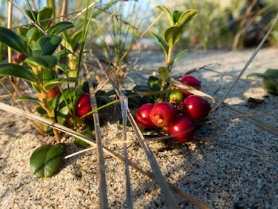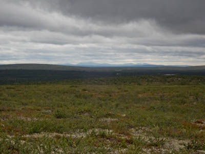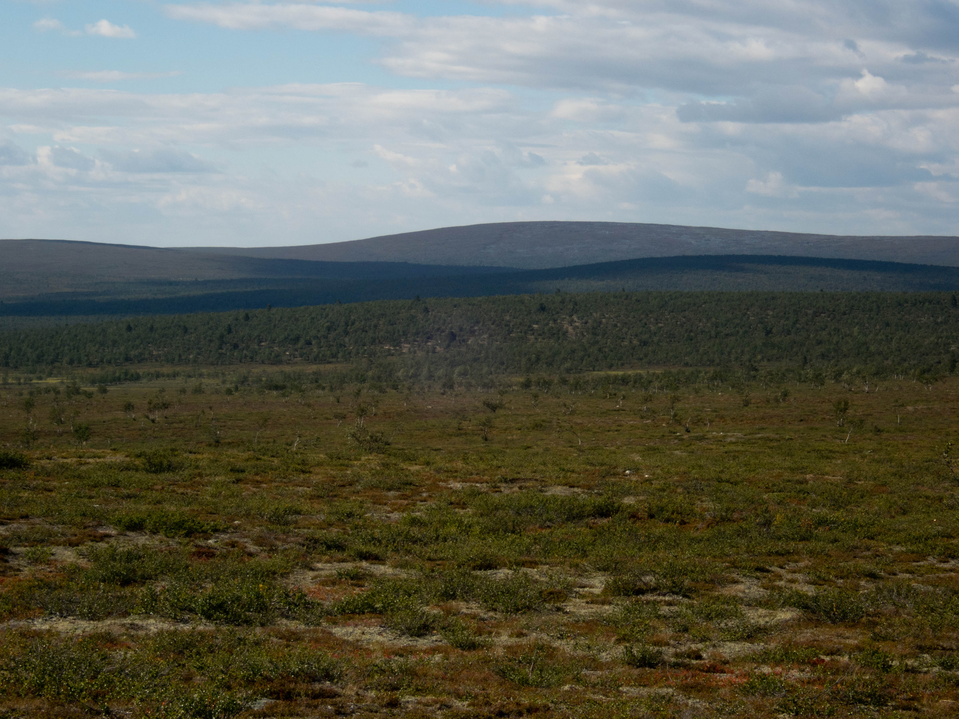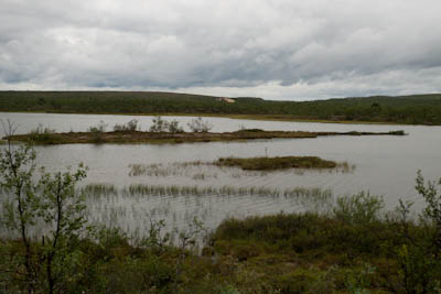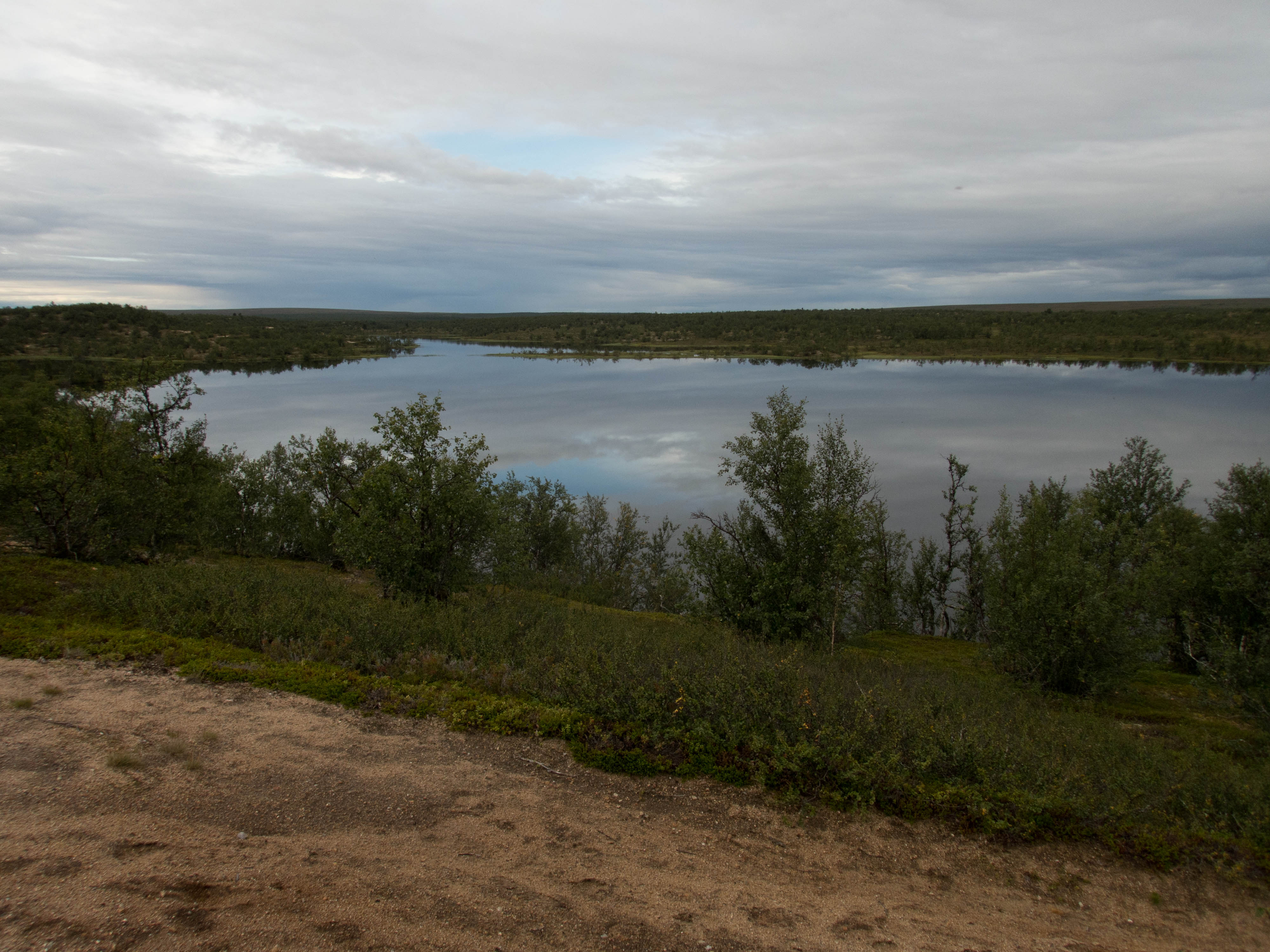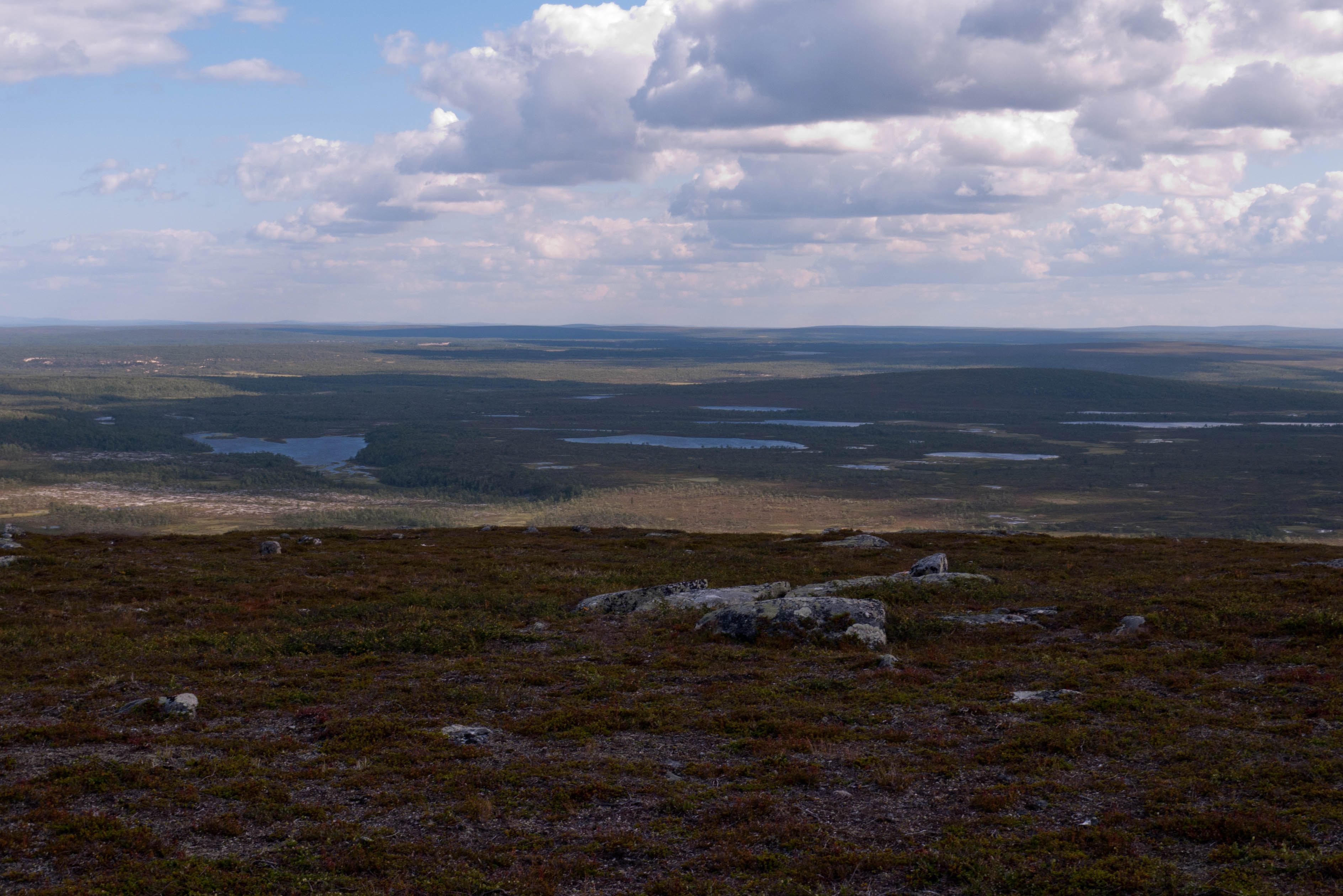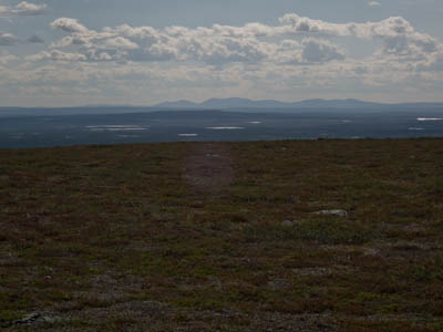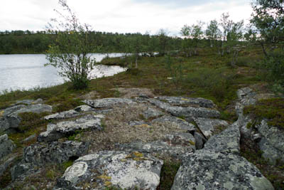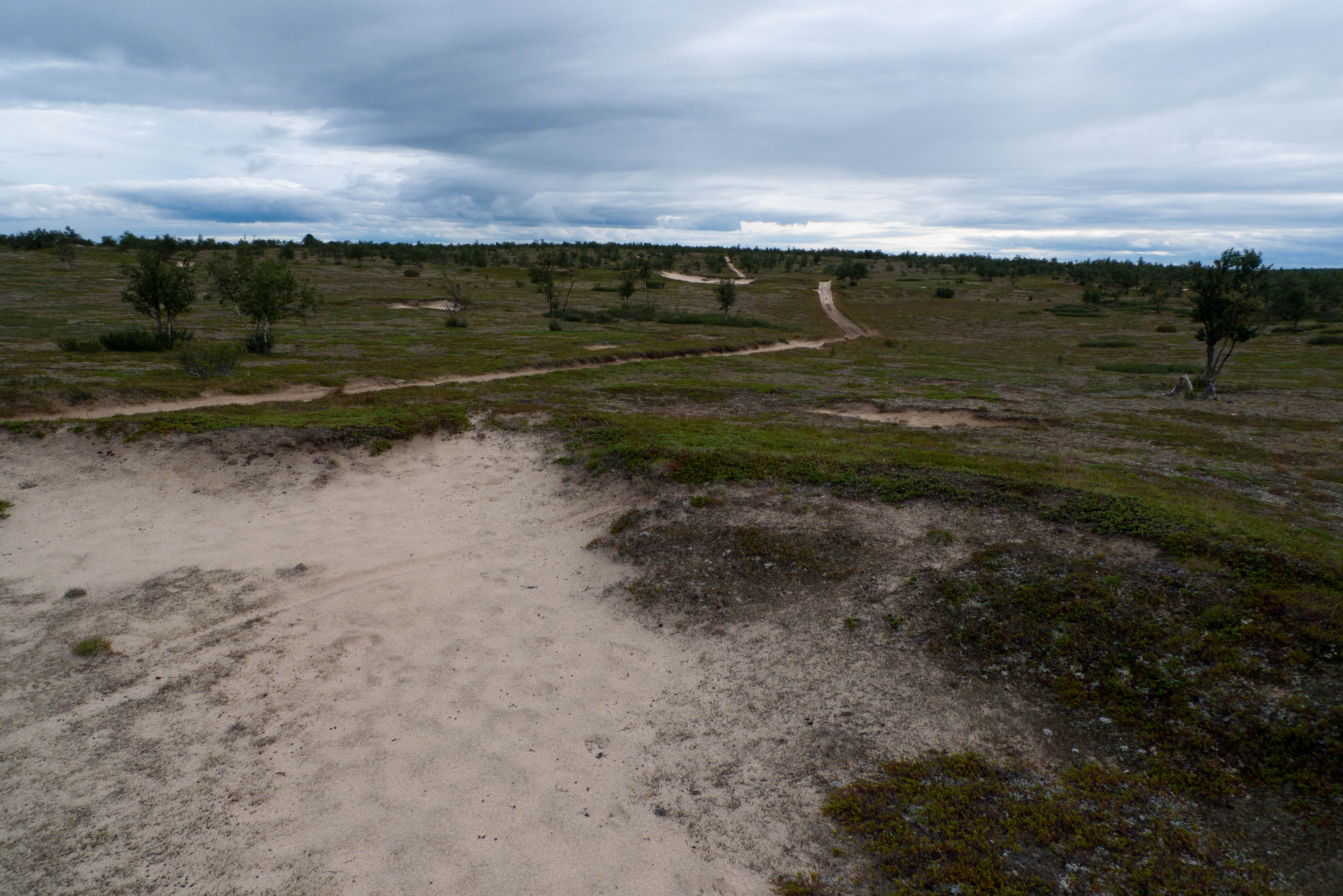Edellinen ilta oli ihan kaunis, mutta kun ei ollut mitään halstrattavaa, mentiin nukkumaan hyvissä ajoin, puolen yön maissa. Niimpä aamulla päästiin liikkeelle jo ennen puolta päivää. Oltiin huomattu, että järvemme eteläpuolella on vahva mönkkäriura, vaikkei sellaista karttaan ole merkitty. Eläteltiin toiveita, että se yhtyisi Risuvaaran itärinteelle merkittyyn polkuun. Ura tosiaan nousi rinteelle juuri kohti merkittyä polkua. Jotenkin siellä ylhäällä tuli sellainen olo, että se menee liikaa vasemmalle. Erosimme urasta omille poluillemme ja oletimme törmäävämme karttaan merkittyyn polkuun vain huomataksemme pian, että helpompaa olisi ollut seurata uraa. Risuvaaran takana virtasi Aiteenjoki, joka piti ylittää kahlaamalla. Siinä olisi ollut paljon mukavampi kalastaa, ainakin perholla, kuin jossain tylsässä järvessä. Matka jatku tukevaa mönkkäriuraa pitkin. Runsaan kilsan tarpomisen jälkeen tulimme varsinaiselle leirintäalueelle, vai pitäisikö sanoa golfkentälle. Maasto oli vähän saman tapaista kuin Kurkkioharjuilla alkumatkasta. Ajateltiin jo jäädä laittamaan sapuskaa jonkun hiekkarantaisen pikkujärven rannalle, mutta ne olivat sillä hetkellä jotenkin vähävetisiä, vähän rutakoita. Jatkoimme matkaa Juovvagielaksen eteläpuolitse kohti Tunturi-Kiuasskaidia. Sen verran kuitenkin alkoi huikomaan, että pysähdyttiin aika pian Juovvagielaksen itäpuolella olevan järven rantaan sapuskoimaan. Tauon jälkeen noustiin Tunturi-Kiuasskaidin huipulle ja otettiin kuvia eri suuntiin. Siellä tuuli niin mahottomasti, että tukka meinas lähteä päästä. Kaakossa ja koillisessa näkyi laajoja soita, joiden välistä piti tähdätä Käkkälöjoen kahlaamolle. Ei siinä paljon tähtäillä tarvinnut, seurasi vaan mönkkäriuraa. Kahlauksen jälkeen etsiskelimme leiripaikkaa joen rannalta, lähinnä ylävirtaan kahlaamosta. Loppujen lopuksi leiriydyimme ihan kahlaamon tuntumaan, vanhalle nuotiopaikalle. Teltta pystytettiin keskelle polun tapaista. Vaara joutua häirityksi oli kuitenkin melko pieni, kun yhtään ihmistä ei ollut nähty ensimmäisen päivän jälkeen. Illalla harrastettiin kalastusta sekä kahlaamon yläpuolisista suvannoista että alapuolisista koskista. Saalis jäi tälläkin kertaa vaatimattomaksi, lähinnä tammukoita, joilla menee vielä monta vuotta saavuttaa 50 cm:n alamitta. Hiekkaa täällä riittää niin, että puolukatkin joutuvat ponnistamaan paljaasta hiekasta.
