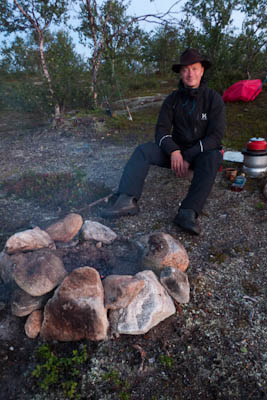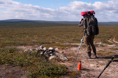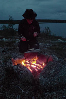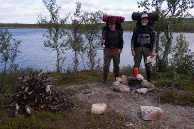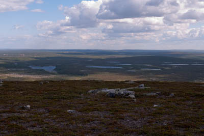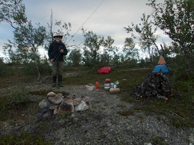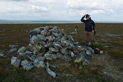Aamupalan jälkeen lähdettiin huiputtamaan Suukisvaaraa. Kun oli päästy vähän ylemmäs, pysähdyttiin ihailemaan maisemia. Kotijärvi vasemmalla ja takana kuvan keskivaiheilla virtaa Aiteenjoki. Huipulla komeili aika komea kivikasa , vaikkei tämä varmaan hirveän mikään hirveän koluttu paikka ole. Huipulta oli vähän parempi näkymä siihen samaan tunturijonoon, jota ihailtiin jo Lenkihaan päällä. Kun maisemat oli ihailtu, palailtiin hakemaan rinkat leiripaikalta ja lähdettiin kohti seuraavaa kohdetta. Mitään varsinaista kohdetta ei ollut päätetty, mutta kun takana oli jo seitsemän kilsaa, tosin ilman kantamuksia, ja kello huiteli puoli viittä, ajateltiin jäädä aika lähelle. Oli niin veltto olo, että ruvettiin katselemaan paikkoja jo parin kilsan jälkeen, Risuvaaran länsipuolisilta järviltä. Monet niistä olivat ruohikkorantaisia ja luotaan työntäviä. Etelään päin mentäessä tilanne parani ja lopulta löytyi ihan hieno leiripaikka, eikä ilmassakaan ollut mitään valittamista. Vähän paranneltiin vanhaa nuotiopohjaa ja sitten kalaan. Näin jälkeenpäin harmittaa, että päädyttiin järvelle, lähinnä siksi että kalansaalis jäi olemattomaksi. Lähes samalla vaivalla olisimme päässeet Aiteenjoelle, joka ei ollutkaan mikään puro, vaan ihan kalastettava joki. No, tähän päätökseen ehkä vaikutti se, ettei tiedetty kuuluuko se meidän lupamme piiriin.