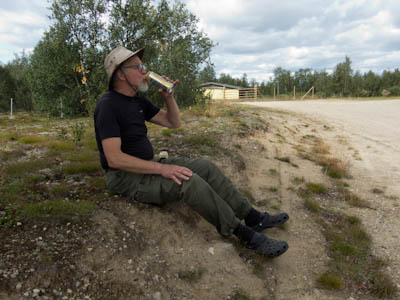 Jäljellä on enää paluu autolle. Kilometrin päässä odottaa sama mönkkäriura, jota pitkin vaellus alkoi. Parin tunnin päästä ollaan autolla. Jännittää hiukan minkä lämpöistä on sihijuoma, jota on jätetty autossa olevaan kylmälaukkuun. Ajoneuvon lastaus Tampereen junaan alkaisi vasta 19:45. Aikaa oli yllin kyllin nauttia sitä, mitä kairaan ei kanneta. Yllättäen se oli ihan sopivasti temperoitua. Olihan viimeisenä yönä mennyt vähän pakkasen puolelle.